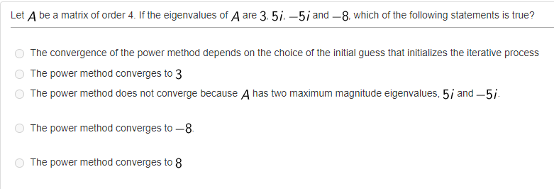 -This option is false. The power method converges to the dominant eigenvalue, which is the eigenvalue with the largest magnitude. In this case, the eigenvalue with the largest magnitude is -8, not 3.