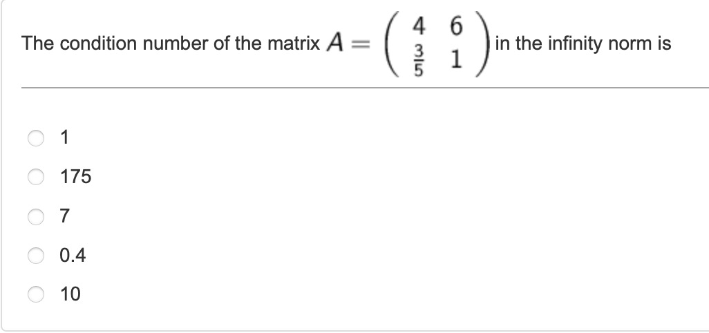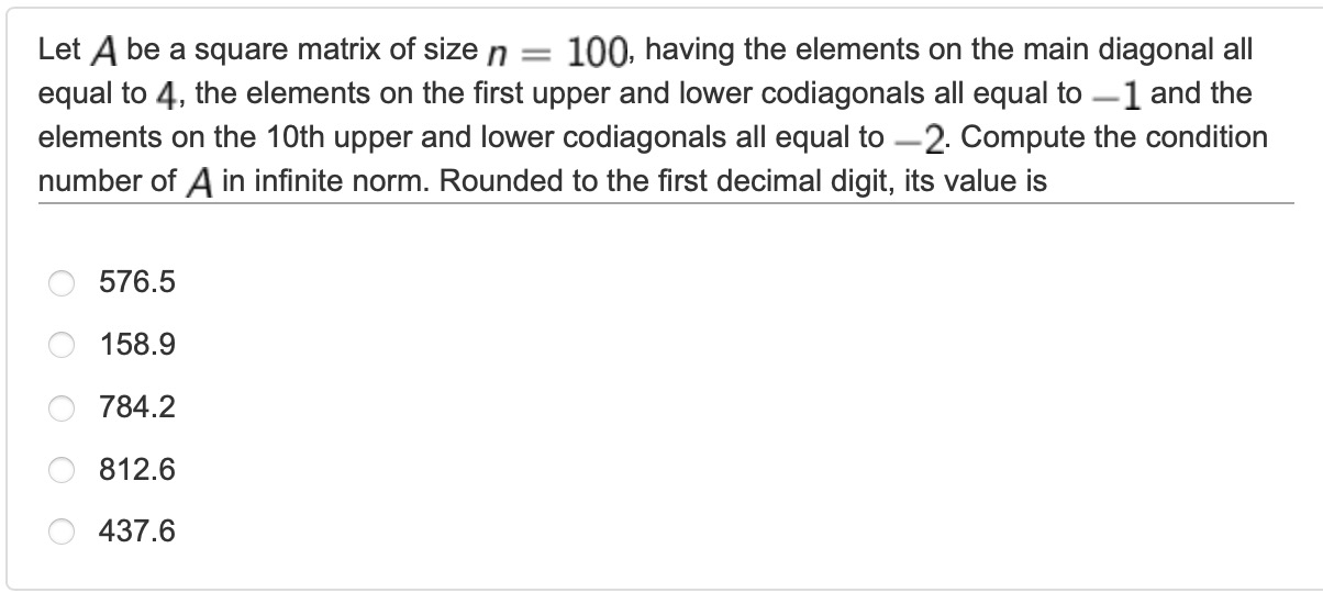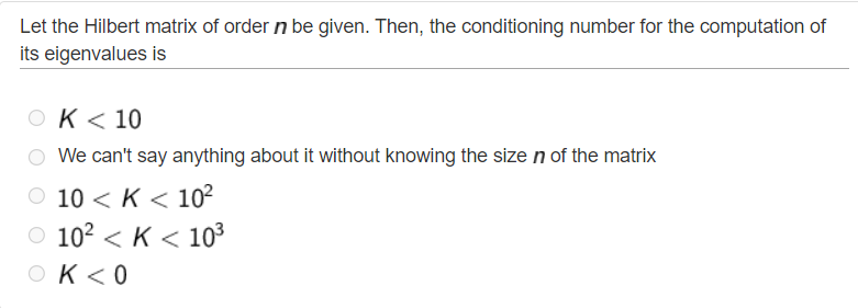 However, without knowing the size n of the matrix in the given question, we cannot determine the exact conditioning number. Therefore, the most conservative assumption we can make is that K<10, implying that the conditioning number is less than 10.