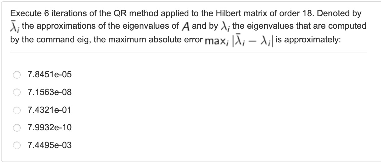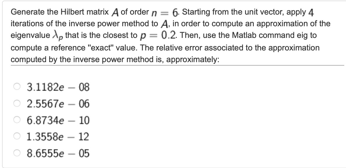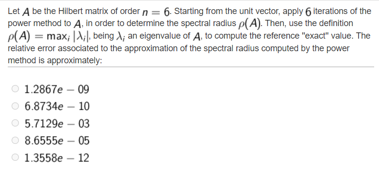 The question asks us to determine the spectral radius of a Hilbert matrix of order 6, denoted as A, using the power method. The power method involves iteratively multiplying a vector by A, normalizing it, and repeating this process several times. After 6 iterations, the resulting vector is used to estimate the dominant eigenvalue and the spectral radius. The question also asks us to compute the exact value of the spectral radius using the definition ρ(A)=max(i)abs(λ(i)), where λ(i) represents an eigenvalue of A. Finally, we are required to calculate the relative error associated with the approximation obtained from the power method.
