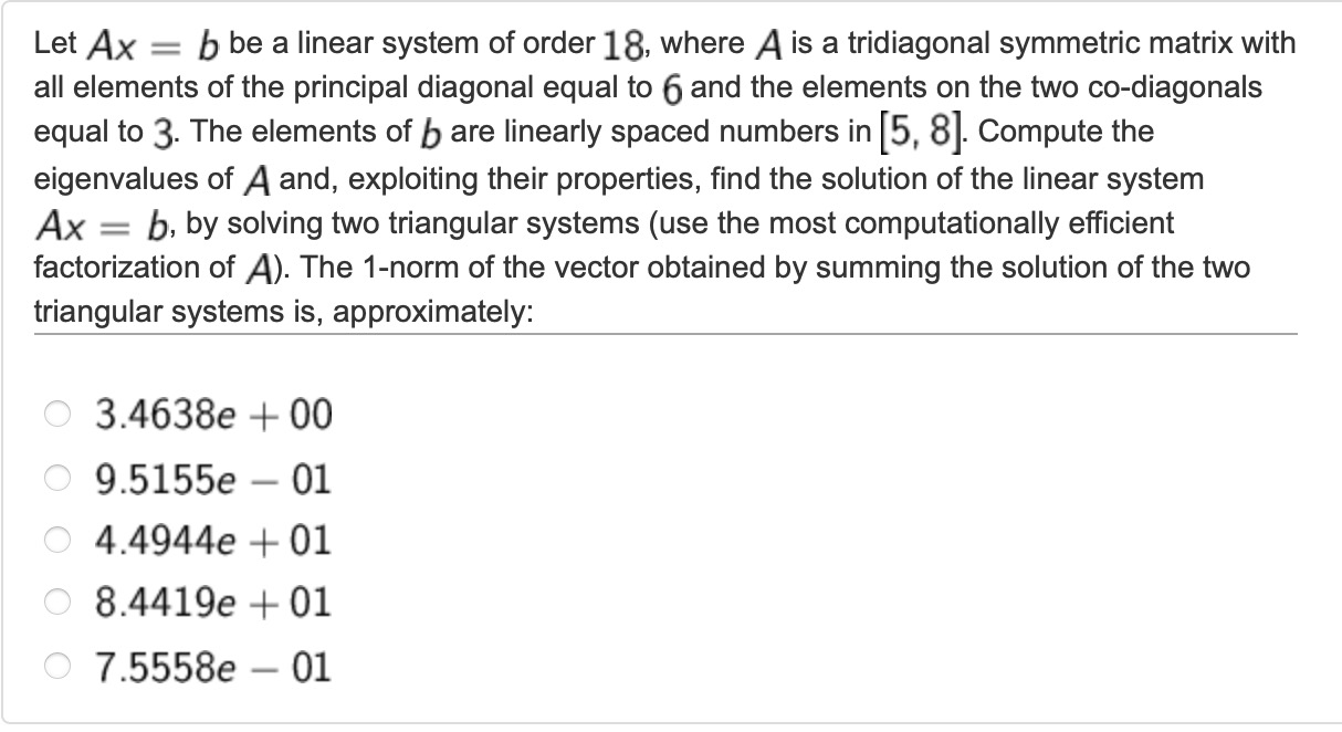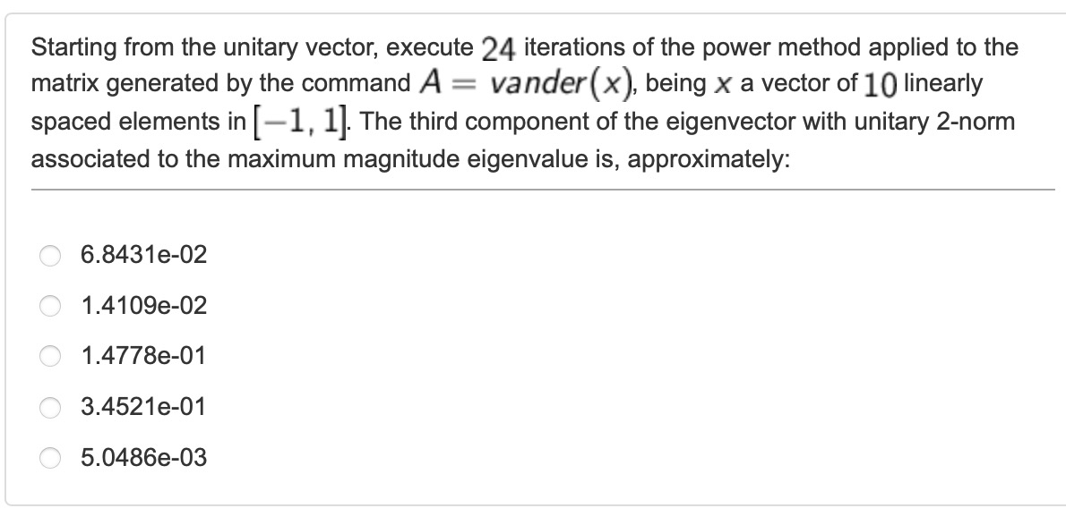 Once we find the closest eigenvalue, we are asked to find the corresponding eigenvector and normalize it such that its 2-norm (Euclidean norm) is equal to 1.