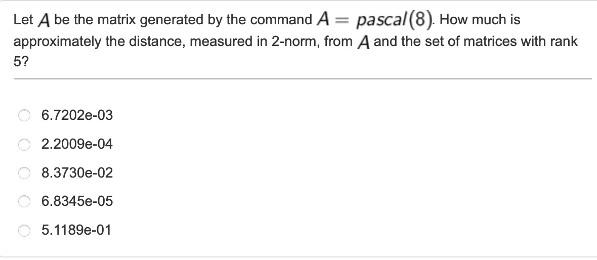 The question asks us to calculate the approximate distance, measured in the 2-norm, between the matrix A generated by the command A = pascal(8) and the set of matrices with rank 5.