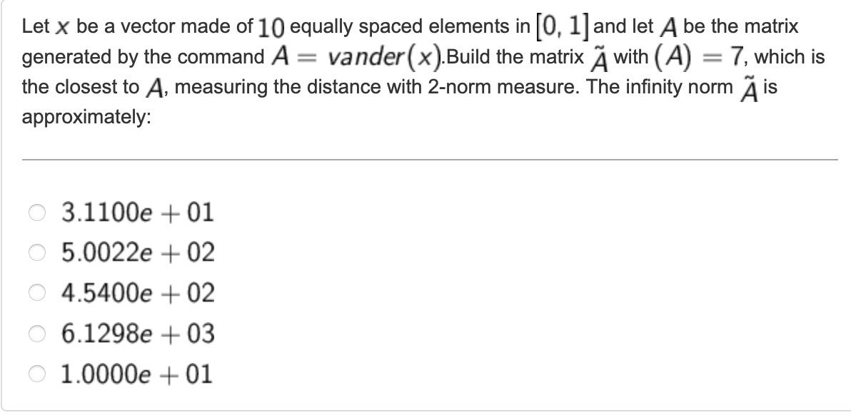 Finally, it calculates the infinity norm of the matrix An using the norm function with the argument inf. The inf argument specifies that the infinity norm should be computed.