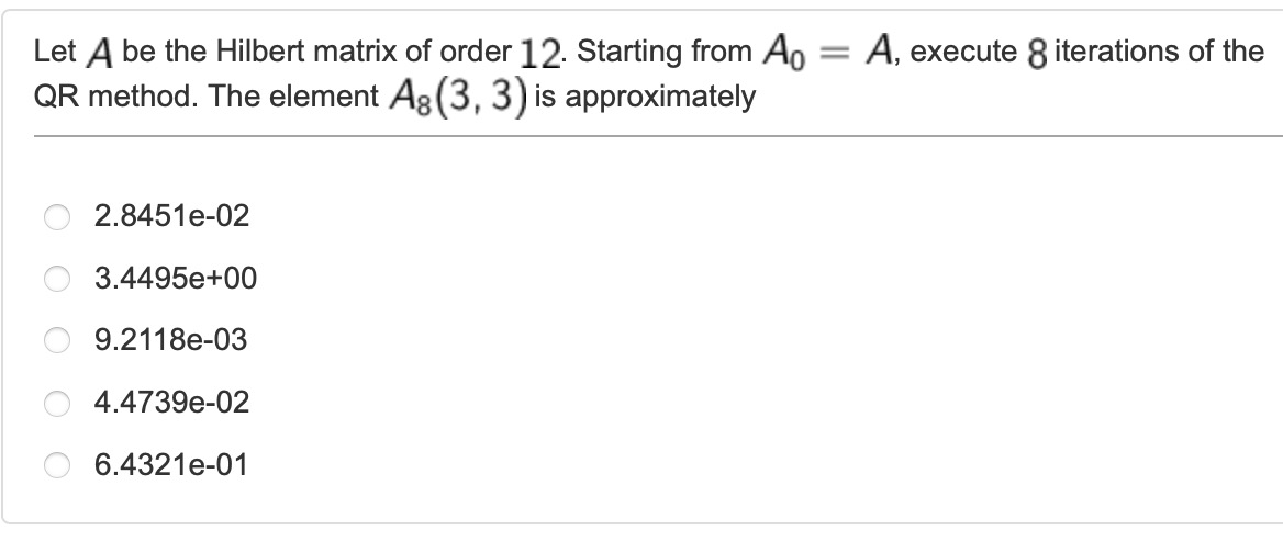 The question specifically asks for the approximate value of element A₈(3,3) after 8 iterations of the QR method. This means we need to perform the QR iterations as described above and retrieve the value at the third row and third column of the resulting matrix A after 8 iterations.