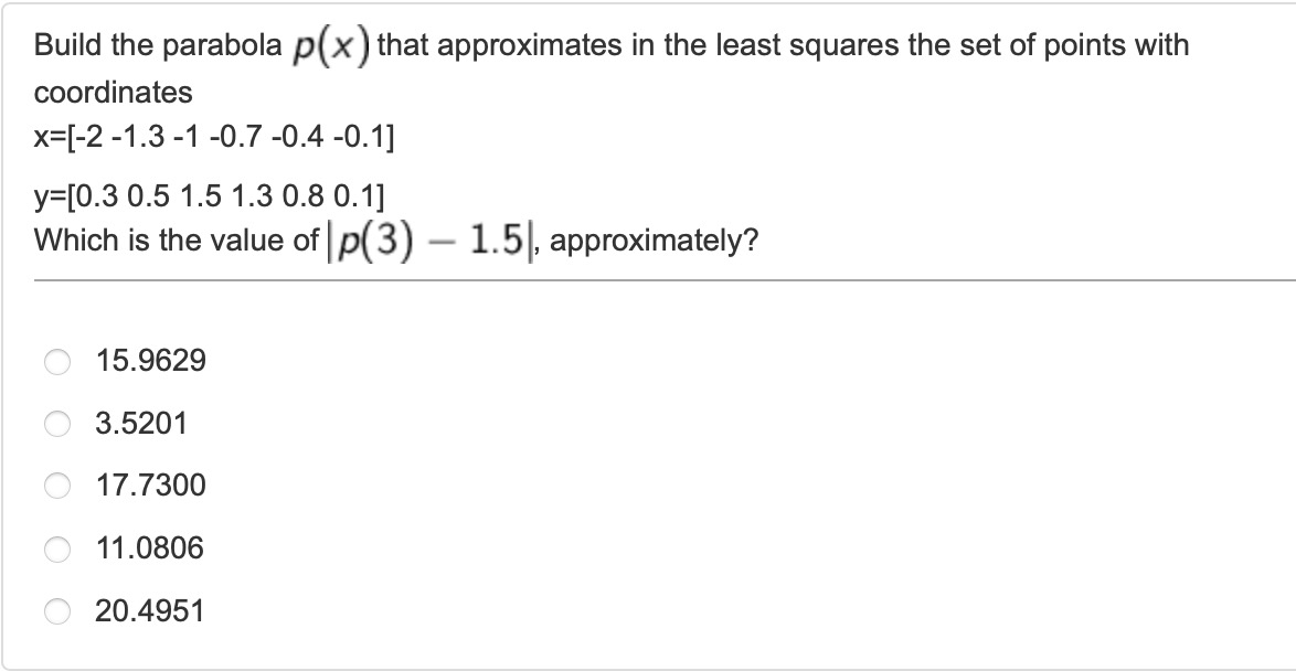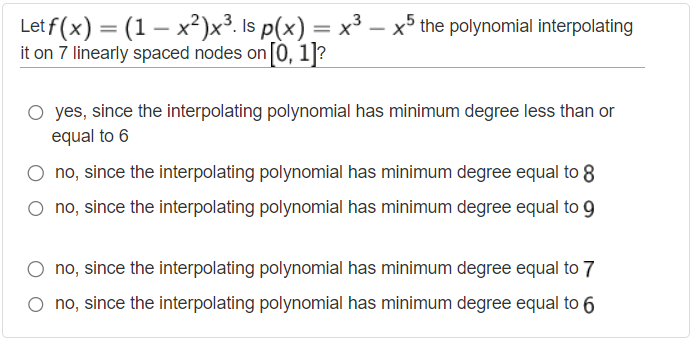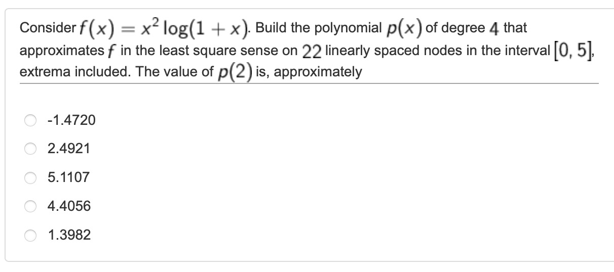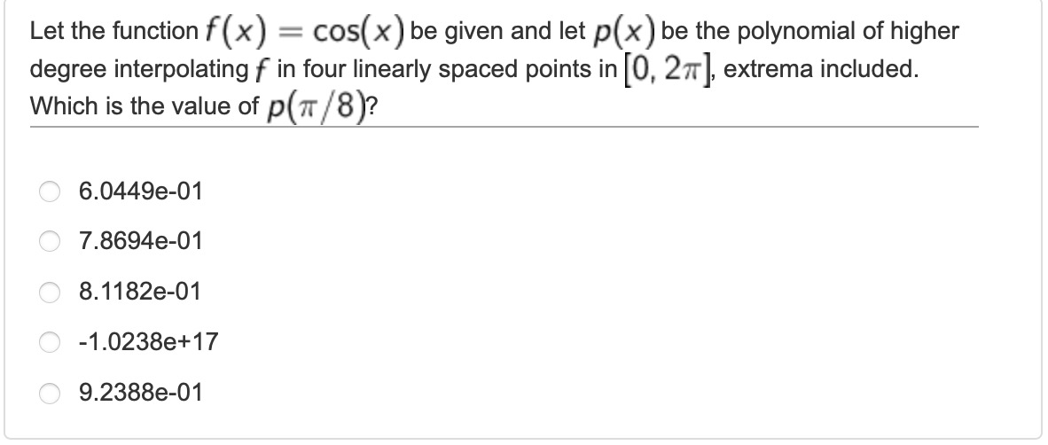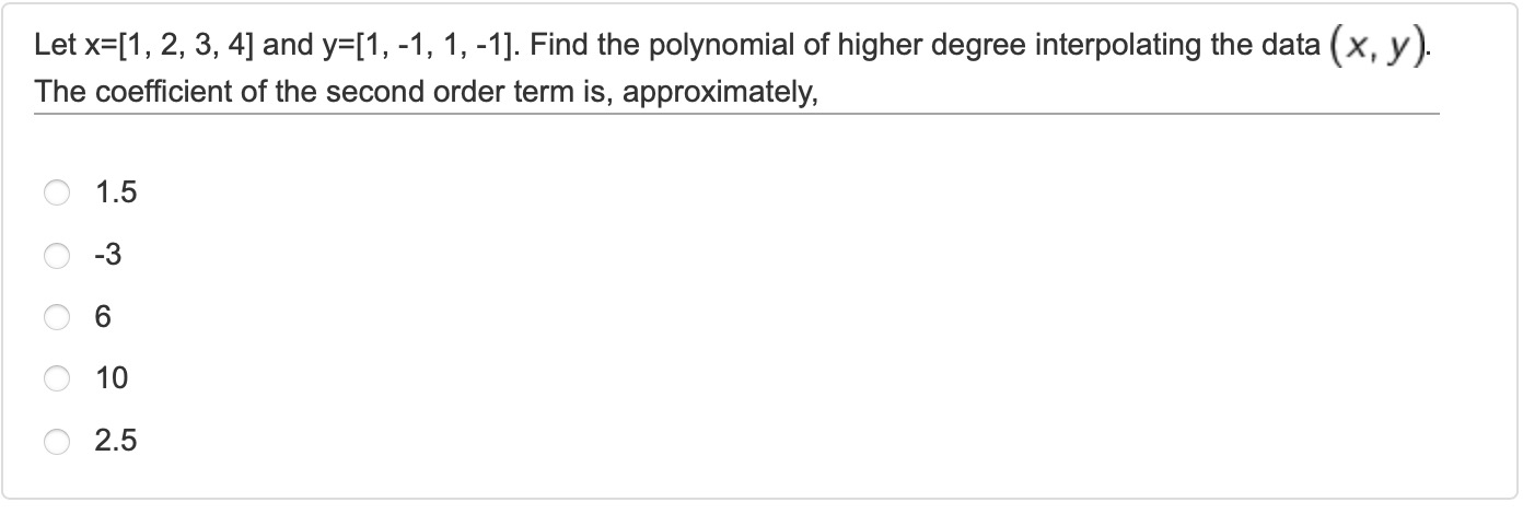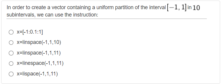 In this question, we were asked 10 sub-intervals. linspace function creates n points between x and y but it creates n-1 sub-intervals between x and y points. So for this question, we need to choose linspace(-1,1,11) to get a 10 subintervals.