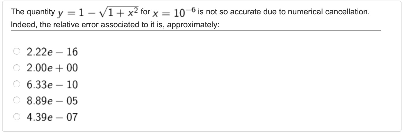 The question asks us to compute the quantities y using two different formulas for two sets of data. One formula involves directly subtracting square roots, while the other avoids numerical cancellation. We need to evaluate the relative errors between the results obtained from the two formulas for each set of data.