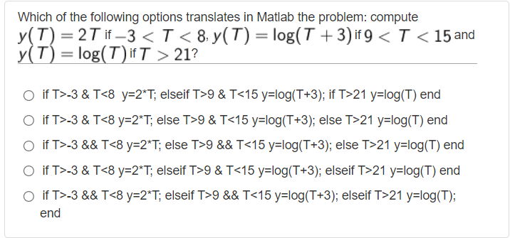 It asks us to write these equations in MATLAB. First, we can eliminate the wrong ones, in MATLAB after an if statement we use elseif statement to add another condition so we can eliminate option A, B and C. We have D and E options left. There is only one different in these options, && and &. Both are logical AND operations. The && though, is a “short-circuit” operator.