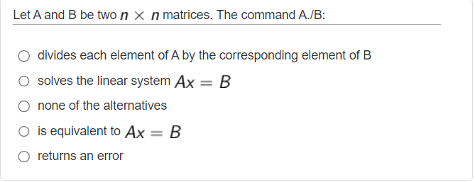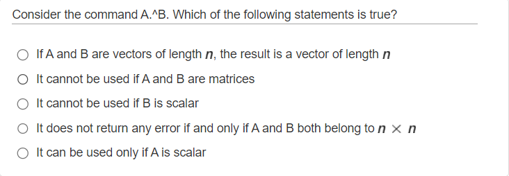 .^ Array power. From MATLAB documentation: “A.^B denotes element-by-element powers. A and B must have compatible sizes. In the simplest cases, they can be the same size or one can be a scalar.” We can eliminate option B, C and E from this definition. For option D, it doesn’t needs to be n x n, we can use .^ operator with 2 x 3 and 1 x 3 matrices so we can eliminate D.