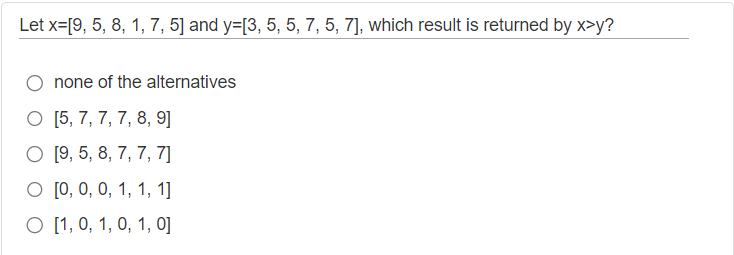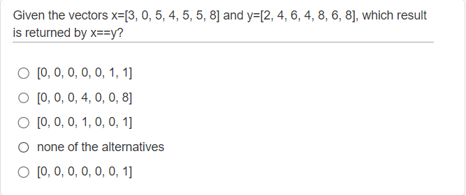 A == B returns a logical array with elements set to logical 1 (true) where arrays A and B are equal; otherwise, the element is logical 0 (false). In this question fourth elements and seventh elements of x and y is equal so the answer will be [0 0 0 1 0 0 1].