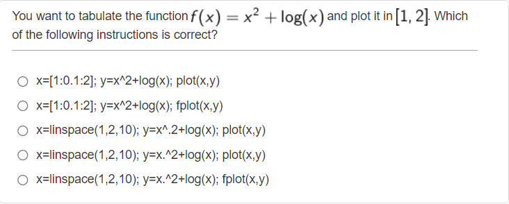 For this kind of questions, we need to be careful for small details. Question asked us to plot the function in an interval. We have x values in [1, 2] interval so we will use plot function because while using fplot function we define a function generally and let MATLAB choose the x values and compute the y values. With this information, we can eliminate fplot, options B and E. In options A and C, there are typos in y function, it needs to be y=x.^2+log(x). Be careful while using .^operator.