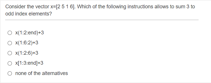 A(1:2:end) = A(1:2:end) * 5 multiplies the odd-indexed components by 5.