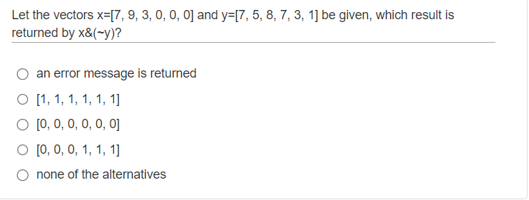 x&(~y) returns a logical array of [0, 0, 0, 0, 0, 0] because we are taking their intersection. For this & operator to return a nonzero number, we need nonzero numbers both from x and y.