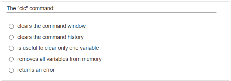 From MATLAB documentation: clc clears all the text from the Command Window, resulting in a clear screen.