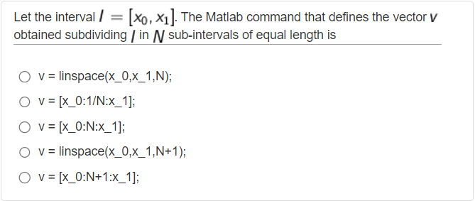 In this question, to divide the interval into N sub-intervals we need to use linspace(x,y,n+1) because linspace divides the intervals into n-1 sub-intervals but we need N amount of sub-intervals. We need to read carefully.