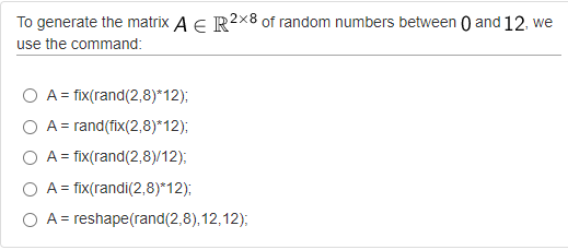 The command A = fix(rand(2, 8) * 12) generates a matrix A ∈ ℝ^(2×8) of random integers between 0 and 12 in MATLAB.