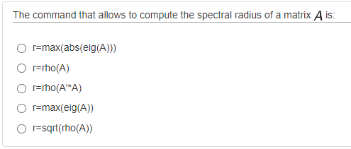 The command that allows us to compute the spectral radius of a matrix A in MATLAB is max(abs(eig(A))).