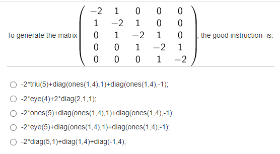 -2*eye(5) creates a 5x5 matrix with -2 on the diagonal and zeros elsewhere. The eye(5) function generates a 5x5 identity matrix, and multiplying it by -2 gives a matrix with -2 on the diagonal.
