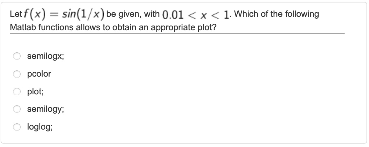 To obtain an appropriate plot of the function f(x)=sin(1/x) with the range 0.01 < x < 1 in MATLAB, we can use the semilogx function.