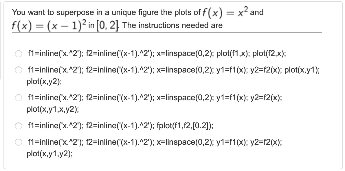 The question asks us to plot two functions, on the interval [0,2] in a single figure using MATLAB. To do this, we need to define a range of x-values within the interval [0,2]. Then, calculate the corresponding y-values for each function using element-wise operations. Next, create a new figure and plot the first and second function, using the same plot function.