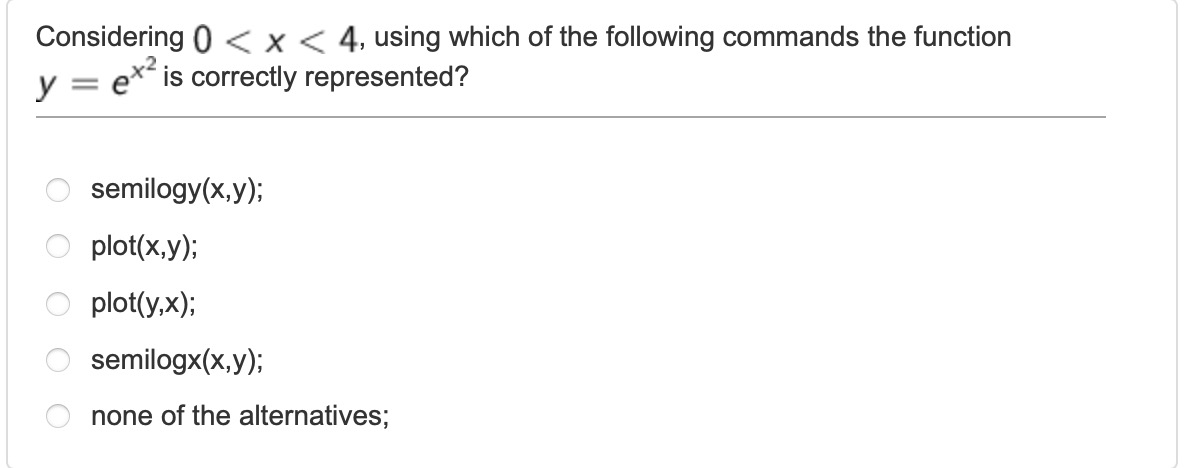 To correctly represent the function y=e^x^2 for the range 0 < x < 4 in MATLAB the appropriate command is semilogy.